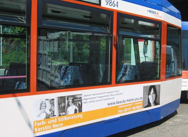 Ich liebe Straßenbahnen. Wenn ich als Kind bei meinen Großeltern in Düsseldorf in der Lichtstraße übernachtete, donnerten die Straßenbahnen um die Kurve und zeichneten ihre Lichterspiele an die Wand. Mein Urgroßvater war Straßenbahnschaffner. Zu Studienzeiten in Bremen wohnte ich zwischen 3 Straßenbahnlinien und bewunderte die Jekyll & Hyde-Musicalstraßenbahn und dachte: Ich möchte auch mal auf der Straßenbahn sein. Jahre später in Darmstadt zieren 3 Meter Straßenbahn mich und meine Farb- und Stilberatung. Jedes Mal wenn der Wagen 9864 an mir vorbeifährt, ist es eine große Freude. Ich bin die Frau mit der Straßenbahn.